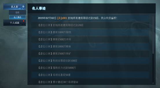 个人成就包括了“封地发展”“成长历练”“内政事务”“奇闻趣事”四大类,每一类都有大量丰富有趣的成就等着大家。